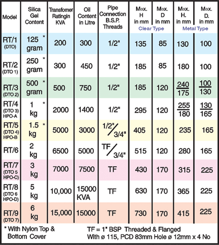 However, for General Guidance we give below the recommended size of Breather for Various transformers ratings along with the Corresponding Oil Contents.